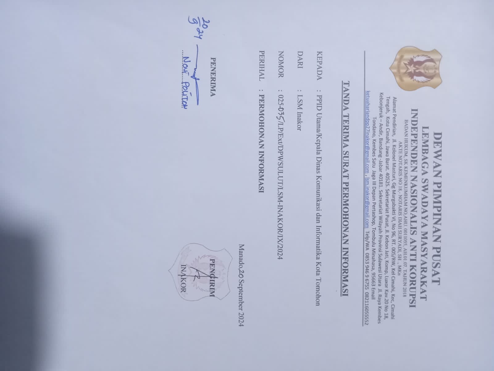 Hari ini Jumat,20/September 2024, LSM INAKOR masukan surat permohonan informasi public dan harapan kami permohonan informasi yang sudah secara patut kami serahkan tidak diabaikan oleh PPID Utama Pemkot Tomohon. “Saya bersama rekan peneliti bidang hukum INAKOR siang tadi sudah serahkan permohonannya dan diterima langsung secara baik oleh Kepala Dinas Kominfo Kota Tomohon,” kata Ketua Harian DPP LSM-INAKOR Rolly Wenas.