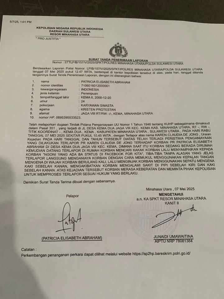 Minahasa Utara – kibarindonesia.com – Seorang ibu muda bernama Patricia Abraham harus menanggung luka fisik dan trauma setelah diduga menjadi korban penganiayaan oleh seorang oknum Polisi Wanita (Polwan) berinisial CD alias Clau, yang diketahui bertugas di Polres Tomohon. Kamis 08/05/2025