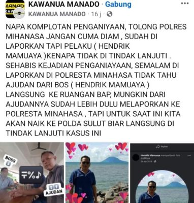 Sulawesi Utara – kibarindonesia.com – kasus penganiayaan terhadap pekerja berinisial A D oleh boss PT Samerot Tri Putra Hendrik Mamuaya heboh grup sosial media FB. Dalam postingan tersebut, korban A D telah di pukuli H M dan di ancam akan dibunuh