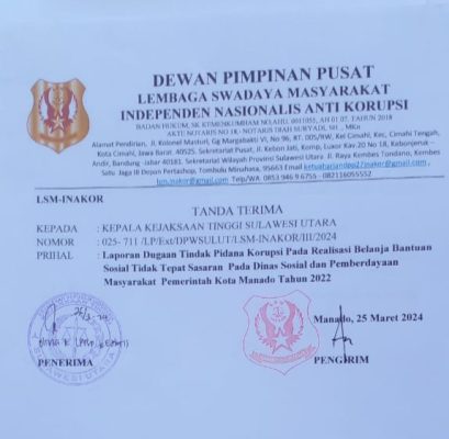 “Secara resmi telah dilaporkan pada Selasa, 26 maret kemarin ke Kejaksaan tinggi Sulawesi Utara, hal ini adalah bentuk dari proses pengawasan masyarakat dalam hal ini sesuai dengan Tupoksi Lembaga Swadaya Masyarakat, Independen Nasionalis anti Korupsi (LSM-INAKOR) karena kami nilai ada sejumlah kejanggalan pada Realisasi Pemberian Bantuan Sosial Berupa Uang Bagi Masyarakat Lanjut Usia yang tertata pada Dinas Sosial Pemerintah Kota Manado tahun 2022,” tutur wenas.