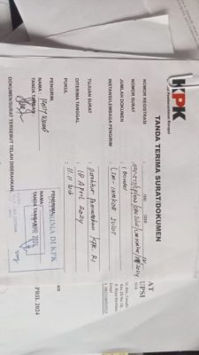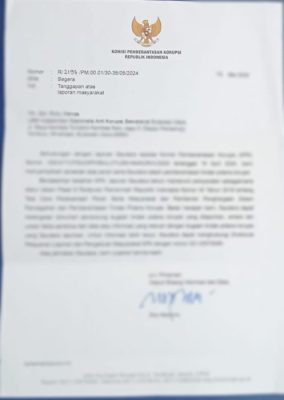 Berdasarkan dokumen yang didapat media surat KPK yang dikirim pada 17 Mey 2024 dua pekan lalu bernomor R/2193/PM.00.01/30-35/05/2024 dengan sifat SEGERA, HAL, Tanggapan atas laporan masyarakat, surat tersebut di teken oleh Deputi Bidang Informasi dan Data KPK, Eko Marjono. Dalam suratnya ada tertulis, sebagaimana dengan laporan saudara kepada Komisi Pemberantasan Korupsi (KPK) tertanggal 16 April 2024 kami menyampaikan apresiasi atas peran serta saudara dalam pemberantasan tindak pidana korupsi.