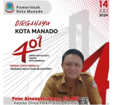 Kepala Dinas Perkim Kota Manado, Peter Alexander Eman ST. MT Mengucapkan Dirgahayu Kota Manado Ke-401 Tahun, Semoga pertumbuhan ekonomi yang berkelanjutan dapat menciptakan kehidupan yang lebih sejahtera bagi semua masyarakat