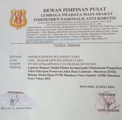Sulawesi Utara – kibarindonesia.com – Lembaga Swadaya Masyarakat Independen Nasionalis Anti Korupsi (INAKOR) dan Lembaga Aspirasi Masyarakat Indonesia (LAMI) Sulawesi Utara datangi Kantor Polda Sulawesi Utara melaporkan dugaan korupsi pelaksanaan proyek Preservasi jalan ruas Lembean-Marawas milik Dinas PUPR Minahasa Utara, Provinsi Sulawesi Utara yang pelaksanaannya menelan anggaran senilai 22 Milyar pada Tahun 2023.
