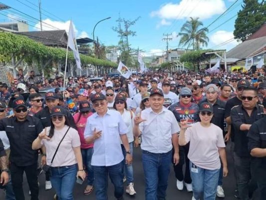 Setidaknya ada ribuan massa bersama pasangan WL MM bergerak dari kediaman WL Terung Kabasaran Kolongan, mereka jalan kaki menuju Kantor KPU Tomohon.