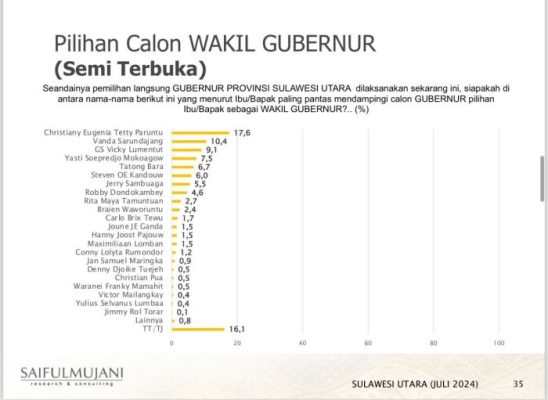 Dari hasil survei tersebut, HJP ternyata menunjukkan elektabilitas yang lebih tinggi dibandingkan beberapa kandidat lainnya, seperti Denny Tuejeh, Victor Mailangkay, dan Yulius.