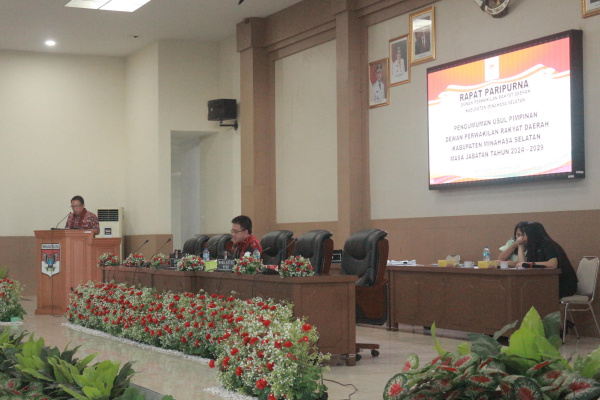 Minahasa Selatan, 26 September 2024 – Dewan Perwakilan Rakyat Daerah (DPRD) Kabupaten Minahasa Selatan menyelenggarakan rapat paripurna dengan agenda pengumuman usulan pimpinan DPRD masa jabatan 2024-2029. Rapat yang berlangsung di Ruang Sidang DPRD Minsel ini dipimpin oleh Ketua DPRD sementara, Stefanus D.N. Lumowa, dan dihadiri oleh 16 dari total 30 anggota DPRD, sehingga memenuhi kuorum.