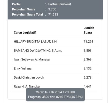 Keduanya unggul berdasarkan data real count sementara KPU. Seperti terpantau dari laman pemilu2024.kpu.go.id, Hillary yang merupakan caleg termuda maju dari Partai Demokrat, saat ini unggul jauh meninggalkan jauh Partai petahana PDIP
