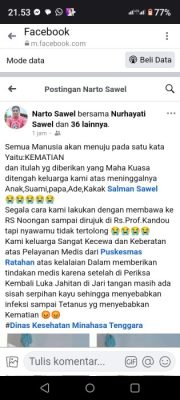 Kami keluarga Sangat Kecewa dan Keberatan atas Pelayanan Medis dari Puskesmas Ratahan atas kelalaian Dalam memberikan tindakan medis karena setelah di Periksa Kembali Luka Jahitan di Jari tangan masih ada sisah serpihan kayu sehingga menyebabkan infeksi sampai Tetanus yg menyebabkan Kematian 😡😡