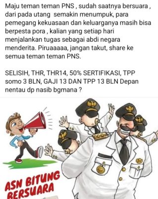 SELISIH, THR, THR14, 50% SERTIFIKASI, TPP somo 3 BLN, GAJI 13 DAN TPP 13 BLN Depan nentau dp nasib bgmana ?. Ditulis singkat dengan ejaan kata-kata Manado