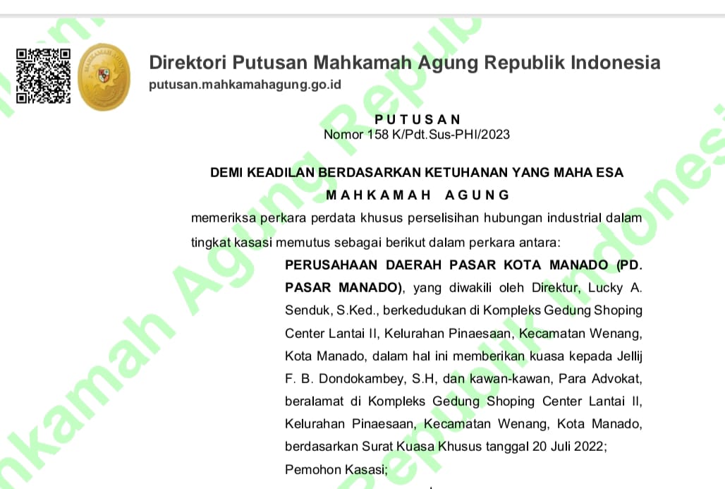 Sebagai berikut, dalam amar Putusan Mahkamah Agung Nomor 158 K/Pdt.Sus – PHI/2023 sudah jelas bahwa hasil putusan MA dengan tegas menyebutkan bahwa proses pemberhentian pegawai BUMD PD PASAR MANADO tidak sah dan tidak beralaskan Hukum.
